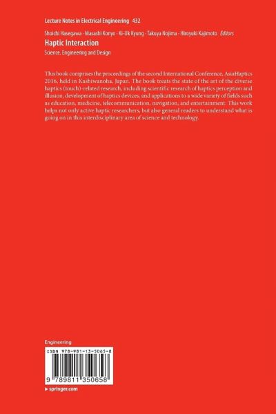 This book comprises the proceedings of the second International Conference, AsiaHaptics 2016, held in Kashiwanoha, Japan. The book treats the state of the art of the diverse haptics (touch)-related research, including scientific research of haptics perception and illusion, development of haptics devices, and applications to a wide variety of fields such as education, medicine, telecommunication, navigation, and entertainment. This work helps not only active haptic researchers, but also general readers to understand what is going on in this interdisciplinary area of science and technology.
