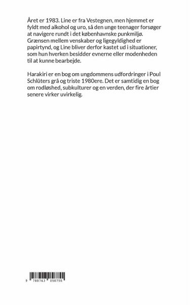 Året er 1983. Line er fra Vestegnen, men hjemmet er fyldt med alkohol og uro, så den unge teenager forsøger at navigere rundt i det københavnske punkmiljø. Grænsen mellem venskaber og ligegyldighed er papirtynd, og Line bliver derfor kastet ud i situationer, som hun hverken besidder evnerne eller modenheden til at kunne bearbejde. Harakiri er en bog om ungdommens udfordringer i Poul Schlüters grå og triste 1980ere. Det er samtidig en bog om rodløshed, subkulturer og en verden, der fire årtier senere virker uvirkelig.