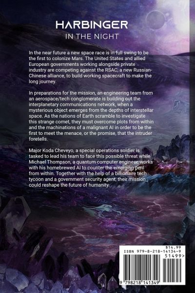 In the near future a new space race is in full swing to be the first to colonize Mars. The United States and allied European governments working alongside private industry are competing against the RSAC, a new Russian-Chinese alliance, to build working spacecraft to make the long journey. In preparations for the mission, an engineering team from an aerospace/tech conglomerate is building out the interplanetary communications network, when a mysterious object emerges from the depths of interstellar space. As the nations of Earth scramble to investigate this strange comet, they must overcome plots from within and the machinations of a malignant AI in order to be the first to meet the menace, or the promise, that the intruder foretells. Major Koda Cheveyo, a special operations soldier is tasked to lead his team to face this possible threat while Michael Thompson, a quantum computer engineer, works with his homebrewed AI to counter the emerging peril from within. Together with the help of a billionaire tech tycoon and a government security agent, their mission could reshape the future of humanity.