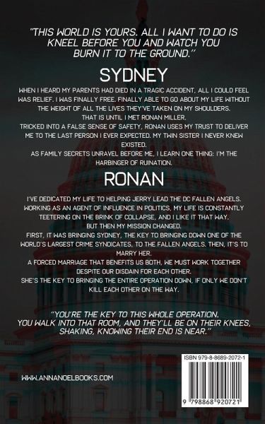 "This world is yours. All I want to do is kneel before you and watch you burn it to the ground." Sydney When I heard my parents had died in a tragic accident, all I could feel was relief. I was finally free. Finally able to go about my life without the weight of all the lives they've taken on my shoulders. That is, until I met Ronan Miller. Tricked into a false sense of safety, Ronan uses my trust to deliver me to the last person I ever expected. My twin sister I never knew existed. As family secrets unravel before me, I learn one thing: I'm the harbinger of ruination. Ronan I've dedicated my life to helping Jerry lead the DC Fallen Angels. Working as an Agent of Influence in politics, my life is constantly teetering on the brink of collapse, and I like it that way. But then my mission changes. First, it was bring Sydney, the key to bringing down one of the world's largest crime syndicates, to the Fallen Angels. Then, it's to marry her. A forced marriage that benefits us both, we're forced to work together despite our distain for each other. She's the key to bringing the entire operation down, if only we don't kill each other on the way. "You're the key to this whole operation. You walk into that room, and they'll be on their knees, shaking, knowing their end is near." . . . This is the second book in the Project Fallen Angels Series of interconnected stand-alones, and is an action romance filled with lies, deceit, steam, and tension. Each book contains a different couple from a different Fallen Angel compound around the country. No cheating, no cliffhangers. HEA Authors note: This book is intended for readers who are 18 and older. It contains mature language, graphic violence, and explicit content. Please read TWs