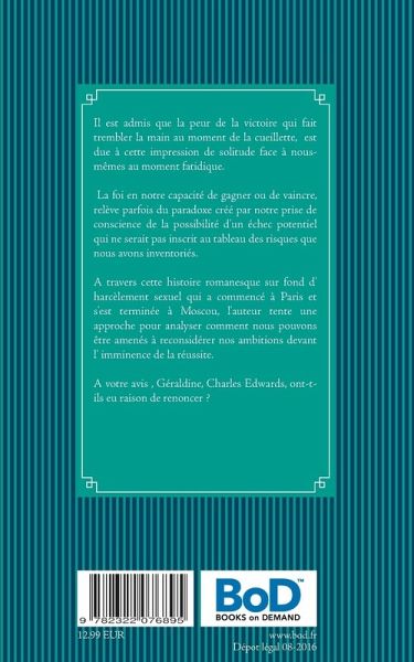 Il est admis que la peur de la victoire qui fait trembler la main au moment de la cueillette, est due à cette impression de solitude face à nous-mêmes au moment fatidique.La foi en notre capacité de gagner ou de vaincre, relève parfois du paradoxe créé par notre prise de conscience de la possibilité d'un échec potentiel qui ne serait pas inscrit au tableau des risques que nous avons inventoriés.A travers cette histoire romanesque sur fond d' harcèlement sexuel qui a commencé à Paris et s'est terminée à Moscou, l'auteur tente une approche pour analyser comment nous pouvons être amenés à reconsidérer nos ambitions devant l' imminence de la réussite.A votre avis , Géraldine, Charles Edwards, ont-t-ils eu raison de renoncer ?