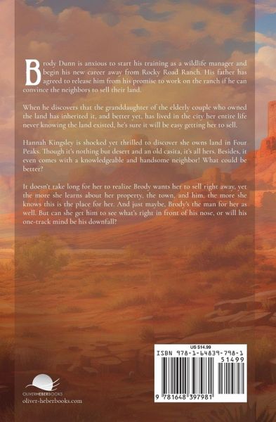 She's the only thing standing in the way of the life he's always wanted... Brody Dunn is anxious to start his training as a wildlife manager and begin his new career away from Rocky Road Ranch. His father has agreed to release him from his promise to work on the ranch if he can convince the neighbors to sell their land. When he discovers that the granddaughter of the elderly couple who owned the land has inherited it, and better yet, has lived in the city her entire life never knowing the land existed, he's sure it will be easy getting her to sell. Hannah Kingsley is shocked yet thrilled to discover she owns land in Four Peaks. Though it's nothing but desert and an old casita, it's all hers. Besides, it even comes with a knowledgeable and handsome neighbor! What could be better? It doesn't take long for her to realize Brody wants her to sell right away, yet the more she learns about her property, the town, and him, the more she knows this is the place for her. And just maybe, Brody's the man for her as well. But can she get him to see what's right in front of his nose, or will his one-track mind be his downfall?