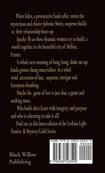 When Eden, a provocative bank teller, meets the mysterious and elusive Johnnie Meier a whole new world of bang, bang shake me up, kind of groove thang, materializes in a whirlwind attraction of lust, suspense, intrigue and European sleuthing. Secrets, half- truths and the biggest bank heist in history is looming. Sparks fly as these dynamic women try to build a world together in the beautiful city of Belfort, France. Maybe the game of love, is just that, a game and nothing more. Who holds their heart with integrity and purpose and who is scheming to take it all reveals itself in this latest edition of the Lesbian Gold Series/ Light Erotica & Mystery.