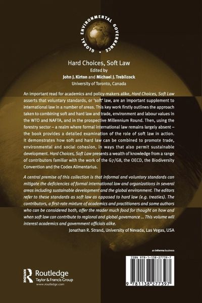 An important read for academics and policy-makers alike, Hard Choices, Soft Law asserts that voluntary standards, or 'soft' law, are an important supplement to international law in a number of areas. This key work firstly outlines the approach taken to combining soft and hard law and trade, environment and labour values in the WTO and NAFTA, and in the prospective Millennium Round. Then, using the forestry sector - a realm where formal international law remains largely absent - the book provides a detailed examination of the role of soft law in action. It demonstrates how soft and hard law can be combined to promote trade, environmental and social cohesion, in ways that also permit sustainable development. The book presents a wealth of knowledge from a range of contributors familiar with the work of the G7/G8, the OECD, the Biodiversity Convention and the Codex Alimentarius.