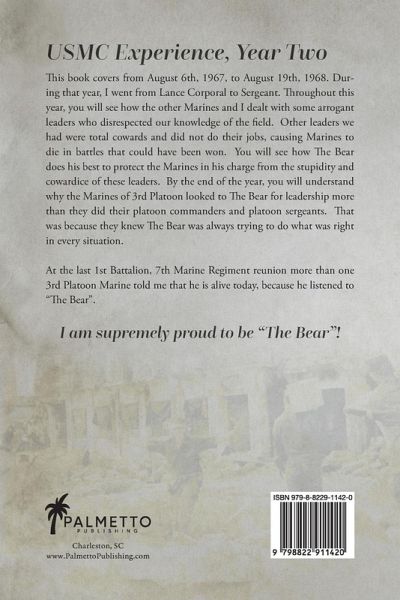 This book covers from August 6th, 1967, to August 19th, 1968. During that year, I went from Lance Corporal to Sergeant. Throughout this year, you will see how the other Marines and I dealt with some arrogant leaders who disrespected our knowledge of the field. Other leaders we had were total cowards and did not do their jobs, causing Marines to die in battles that could have been won. You will see how The Bear does his best to protect the Marines in his charge from the stupidity and cowardice of these leaders. By the end of the year, you will understand why the Marines of 3rd Platoon looked to The Bear for leadership more than they did their platoon commanders and platoon sergeants. That was because they knew The Bear was always trying to do what was right in every situation. At the last 1st Battalion, 7th Marine Regiment reunion more than one 3rd Platoon Marine told me that he is alive today, because he listened to "The Bear". I am supremely proud to be "The Bear"!