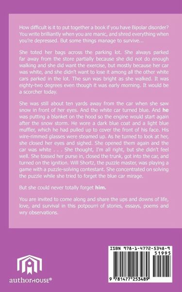 How diffi cult is it to put together a book if you have Bipolar disorder? You write brilliantly when you are manic, and shred everything when you're depressed. But some things manage to survive... She toted her bags across the parking lot. She always parked far away from the store partially because she did not do enough walking and she did want the exercise, but mostly because her car was white, and she didn't want to lose it among all the other white cars parked in the lot. The sun was bright as she walked. It was eighty-two degrees even though it was early morning. It would be a scorcher today. She was still about ten yards away from the car when she saw snow in front of her eyes. And the white car turned blue. And he was putting a blanket on the hood so the engine would start again after the snow storm. He wore a dark blue coat and a light blue muffl er, which he had pulled up to cover the front of his face. His wire-rimmed glasses were steamed up. As he turned to look at her, she closed her eyes and sighed. She opened them again and the car was white . . . She thought, I'm all right, but she didn't feel well. She tossed her purse in, closed the trunk, got into the car, and turned on the ignition. Will Shortz, the puzzle master, was playing a game with a puzzle-solving contestant. She concentrated on solving the puzzle while she tried to forget the blue car mirage. But she could never totally forget him. You are invited to come along and share the ups and downs of life, love, and survival in this potpourri of stories, essays, poems and wry observations.