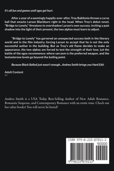 It's all fun and games until egos get hurt. After a year of a seemingly happily-ever-after, Troy Babilonia throws a curve ball that smacks Larson Blackburn right in the head. When Troy's debut novel, "Bridge to Lonely," threatens to overshadow Larson's own success, inviting a past shadow into the light of their present, the two alphas must learn to adjust. "Bridge to Lonely" has garnered an unexpected success both in the literary world and in the film industry, forcing Larson to accept that he is not the only successful author in the building. But as Troy's old flame decides to make an appearance, the two alphas are forced to test the strength of their love. Let the battle of the egos recommence; where sarcasm is the preferred weapon, and the testosterone levels go beyond the boiling point. Because Black Balled just wasn't enough...Andrea Smith brings you Hard Edit. Adult Content 18+