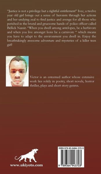 "Justice is not a privilege but a rightful entitlement" Ivec, a twelveyear old girl brings out a sense of heroism through her actionsand her undying zeal to find justice and avenge for all those whoperished in the brutal and gruesome hands of police officer calledBellick Nassir. "When you dwell among antelopes, be a herbivoreand when you live amongst lions be a carnivore " which meansyou have to adapt to the environment you dwell in. Enjoy thebreathtakingly awesome adventure and mysteries of a killer teengirl!