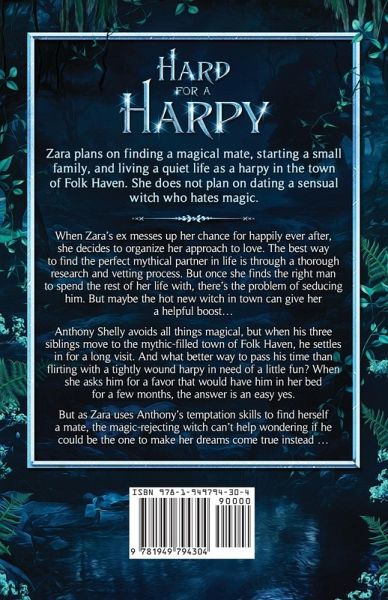Zara plans on finding a magical mate, starting a small family, and living a quiet life as a harpy in the town of Folk Haven. She does not plan on dating a sensual witch who hates magic. When Zara's ex messes up her chance for happily ever after, she decides to organize her approach to love. The best way to find the perfect mythical partner in life is through a thorough research and vetting process. But once she finds the right man to spend the rest of her life with, there's the problem of seducing him. But maybe the hot new witch in town can give her a helpful boost... Anthony Shelly avoids all things magical, but when his three siblings move to the mythic-filled town of Folk Haven, he settles in for a long visit. And what better way to pass his time than flirting with a tightly wound harpy in need of a little fun? When she asks him for a favor that would have him in her bed for a few months, the answer is an easy yes. But as Zara uses Anthony's temptation skills to find herself a mate, the magic-rejecting witch can't help wondering if he could be the one to make her dreams come true instead ...
