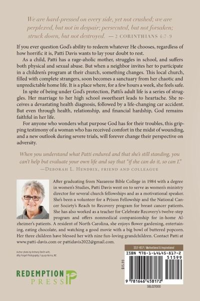 We are hard-pressed on every side, yet not crushed; we are perplexed, but not in despair; persecuted, but not forsaken; struck down, but not destroyed. (2 Corinthians 4:7-9) If you ever question God's ability to redeem whatever He chooses, regardless of how horrific it is, Patti Davis wants to lay your doubt to rest. As a child, Patti has a rage-aholic mother, struggles in school, and suffers both physical and sexual abuse. But when a neighbor invites her to participate in a children's program at their church, something changes. This local church, filled with complete strangers, soon becomes a sanctuary from her chaotic and unpredictable home life. It is a place where, for a few hours a week, she feels safe. In spite of being under God's protection, Patti's adult life is a series of struggles. Her marriage to her high school sweetheart leads to heartache. She receives a devastating health diagnosis, followed by a life-changing car accident. But even through health, relationship, and financial hardship, God remains faithful in her life. For anyone who wonders what purpose God has for their troubles, this gripping testimony of a woman who has received comfort in the midst of wounding, and a new outlook during severe trials, will forever change their perspective on adversity.