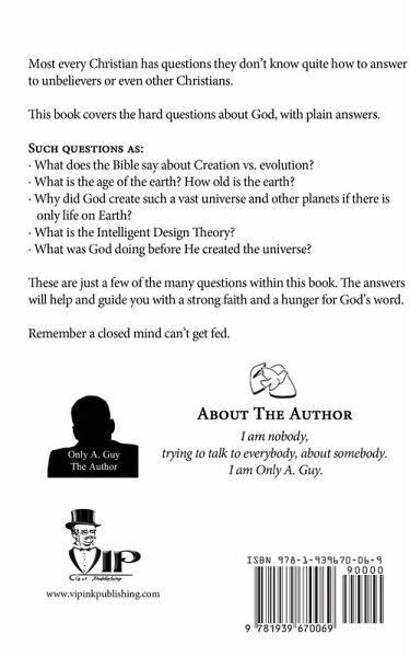 Most every Christian has questions they don't know quite how to answer to unbelievers or even other Christians. This book covers the hard questions about God, with plain answers. Such questions as: What does the Bible say about Creation vs. Evolution? What is the age of the earth? How old is the earth? Why did God create such a vast universe and other planets if there is only life on Earth? What is the Intelligent Design Theory? What was God doing before He created the universe? These are just a few of the many questions within this book. The answers will help and guide you with a strong faith and a hunger for God's word. Remember a closed mind can't get fed.