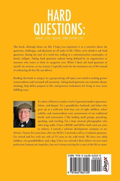 This book, although about my life, I hope you experience it as a narrative about the questions, challenges, and decisions we all make in life. Often, we're afraid to ask hard questions, fearing the start of a word war, ending in a communication catastrophe, or family collapse. Asking hard questions reduces being defined by an organization or someone who wants to limit or categorize you. When I don't ask hard questions of myself, my motives, or my actions, I typically settle for the minimum out of life instead of embracing all that life can deliver. Reading this book or using it in a group setting will open your mind to seeking greater connectedness and increased self-awareness. Asking hard questions can stimulate deeper thinking, help define purpose in life, and generate enthusiasm for living in new, more fulfilling ways. It's taken a lifetime to realize a lack of questions leads to ignorance, failure, and despair. I'm a grandfather, husband, and father who grew up as a mid-west farm boy, one of eight children, where stability and connectedness were cornerstones of our traditional family and community. I like leading small groups, preaching, speaking, and traveling. I'm a busy amateur photographer who takes long walks. I have a BSME and MDiv; both took ten years to achieve. I started a software development company in my thirties. Twenty-five years later, after my M.Div. I received a call to a Lutheran pastorate. I'm retired and live with my wife of 55 years in the cold north. We have two adult children, two grandchildren, and a dog. I have not arrived; I don't believe we ever reach perfection; humans are imperfect, but we're always striving for a taste of the life to come.
