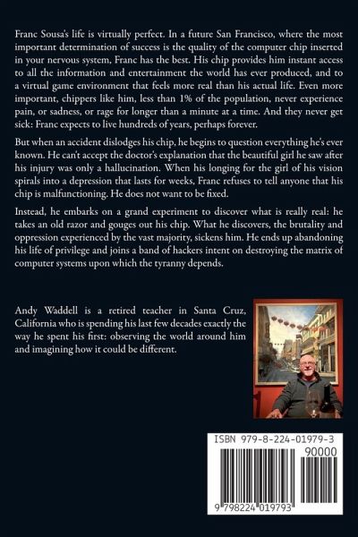 Franc Sousa's life is virtually perfect. In a future San Francisco, where the most important determination of success is the quality of the computer chip inserted in your nervous system, Franc has the best. His chip provides him instant access to all the information and entertainment the world has ever produced, and to a virtual game environment that feels more real than his actual life. It has also helped him develop his coding skills to a level where his future employment for the V.T.B., the company that runs everything, is assured. Even more important, chippers like him, less than 1% of the population, never experience pain, or sadness, or rage for longer than a few seconds at a time. And they never get sick: Franc expects to live hundreds of years, perhaps forever. But when an accident dislodges his chip, he begins to question everything he's ever known. He can't accept the doctor's explanation that the beautiful girl he saw after his accident was only a hallucination. When his longing for the girl of his vision spirals into a depression that lasts for weeks, Franc refuses to tell anyone that his chip is malfunctioning. He does not want to be fixed. Instead, he embarks on a grand experiment to discover what is really real: he takes an old razor and gouges out his chip. What he discovers, the dystopian world of brutality and oppression experienced by the vast majority, sickens him. He ends up abandoning his life of privilege and joins a band of hackers intent on destroying the matrix of computer systems upon which the tyranny depends.