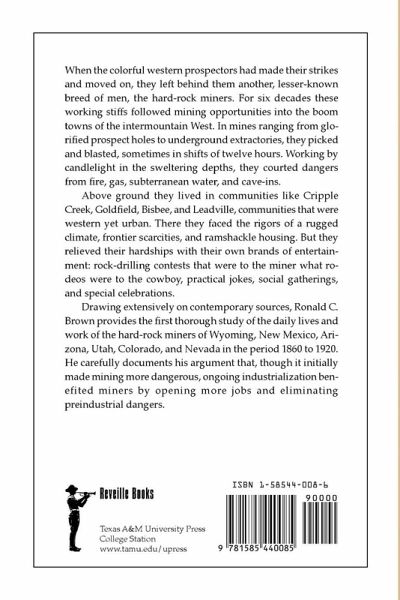 When the colorful western prospectors had made their strikes and moved on, they left behind them another, lesser known breed of men, the hard-rock miners. For six decades these working stiffs followed mining opportunities into the boom towns of the intermountain West and gouged from the depths other men's wealth. In mines ranging from glorified prospect holes to underground extractories, they picked and blasted, sometimes in shifts of twelve hours, not only ore and minerals but also lung-destroying dust. Working by candle light in the ill-ventilated, narrow, and often sweltering depths, they courted dangers from fire, gas, subterranean water, and cave-ins. Management's interest in high productivity and profits often jeopardized miners' needs for a living wage and job security. Some miners retaliated by high-grading, or stealing their bosses' ore, for the old miners' maxim told them "gold belongs to him wot finds it." Above ground they lived in communities like Cripple Creek, Goldfield, Bisbee, and Leadville, communities that were western and yet urban. There they faced the rigors of a rugged climate, frontier scarcities, and ramshackle housing. But they relieved their hardships with their own brands of entertainment: rock-drilling contests that were to the miner what rodeos were to the cowboy; practical jokes like shivarees, snipe hunts, and social gatherings, picnics, and special celebrations. Drawing extensively on contemporary sources, Ronald C. Brown provides the first thorough study of the daily lives and work of hard-rock miners of Wyoming, New Mexico, Arizona, Utah, Colorado, and Nevada in the period 1860 to 1920. He carefully documents his argument that, though it initially made mining more dangerous, ongoing industrialization benefited miners by opening more jobs and, in the long run, by eliminating preindustrial dangers.