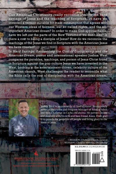 Can American Christianity really reconcile itself to the hard sayings of Jesus and the teaching of Scripture, or have we invented a version suitable for mass consumption that agrees with our Western ideas of fairness, our so-called rights, and the all-important American dream? In order to make God approachable, have we left out the parts of the New Testament we don't like? Is there a cost to being a disciple of Jesus? How do we reconcile the teachings of the Jesus we find in Scripture with the American Jesus we have created? In Hard Sayings: Reconciling the Cost of Discipleship and the American Dream, pastor and international speaker Joshua West compares the parables, teachings, and person of Jesus Christ found in Scripture against the pop culture Jesus we have invented in the West. Looking at the entertainment-driven, celebrity culture of the American church, West challenges the reader to reconcile what the Bible calls the cost of discipleship with the American dream.
