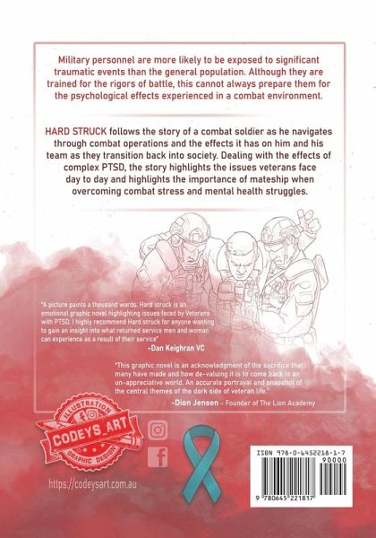 Military personnel are more likely to be exposed to significant traumatic events than the general population. Although they are trained for the rigors of battle, this cannot always prepare them for the psychological effects experienced in a combat environment. HARD STRUCK follows the story of a combat soldier as he navigates through combat operations and the effects it has on him and his team as they transition back into society. Dealing with the effects of complex PTSD, the story highlights the issues veterans face day to day and highlights the importance of mate ship when overcoming combat stress and mental health struggles. From the Author: The story itself only took a couple of days to put on paper, but the extensive illustration was years in the making. As an infantryman, we pride ourselves on putting 'Duty First', and with deployments and countless months in the field, often I had to put this project on the back burner. As I've written and illustrated every part of this project myself, I really want my efforts to make a difference in people's lives. So, it needed to be as polished as can be. Now that I'm a full time Illustrator, I wanted to use what I've learnt in the military and compliment it with my design background to produce something that can help people. We lose veterans every day who struggle with poor mental health. The average person has some understanding of PTSD, but not many fully appreciate the other aspects of life that are affected as a result. From homelessness and relationships breakdown, even to suicide. I hope this book can fill in some of the grey area and shed some light on an ongoing situation.