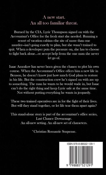 "Lisa Phillips is the master of edge-of-your-seat action and suspense!" - USA Today best-selling, RITA winning author, Susan May Warren A new start. An all too familiar threat. Burned by the CIA, Lyric Thompson signed on with the Accountant's Office for the fresh start she needed. Running a resort of vacation cabins-the site of more than one murder-isn't going exactly to plan, but she wasn't trained to quit. When a developer puts the pressure on, she has to choose to fight back alone...or accept help from the one man she never let go of. Isaac Amrakov has never been given the chance to plot his own course. When the Accountant's Office offers him a new life in Benson, he doesn't know just how much God plans to restore in his life. But the construction crew he's signed on with are up to something. The man he wants to be would wade in, but Isaac can't do the right thing and keep Lyric safe at the same time. Not without putting everything he wants in jeopardy. These two trained operatives are in for the fight of their lives. But will they stand together, or let life tear them apart again? This stand-alone story is part of the accountant's office series, Last Chance Downrange. An all-new setting. An all-new set of characters. *Christian Romantic Suspense.
