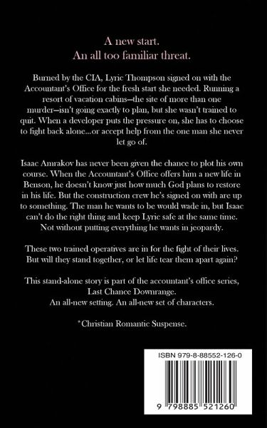 "Lisa Phillips is the master of edge-of-your-seat action and suspense!" - USA Today best-selling, RITA winning author, Susan May Warren A new start. An all too familiar threat. Burned by the CIA, Lyric Thompson signed on with the Accountant's Office for the fresh start she needed. Running a resort of vacation cabins-the site of more than one murder-isn't going exactly to plan, but she wasn't trained to quit. When a developer puts the pressure on, she has to choose to fight back alone...or accept help from the one man she never let go of. Isaac Amrakov has never been given the chance to plot his own course. When the Accountant's Office offers him a new life in Benson, he doesn't know just how much God plans to restore in his life. But the construction crew he's signed on with are up to something. The man he wants to be would wade in, but Isaac can't do the right thing and keep Lyric safe at the same time. Not without putting everything he wants in jeopardy. These two trained operatives are in for the fight of their lives. But will they stand together, or let life tear them apart again? This stand-alone story is part of the accountant's office series, Last Chance Downrange. An all-new setting. An all-new set of characters. *Christian Romantic Suspense.