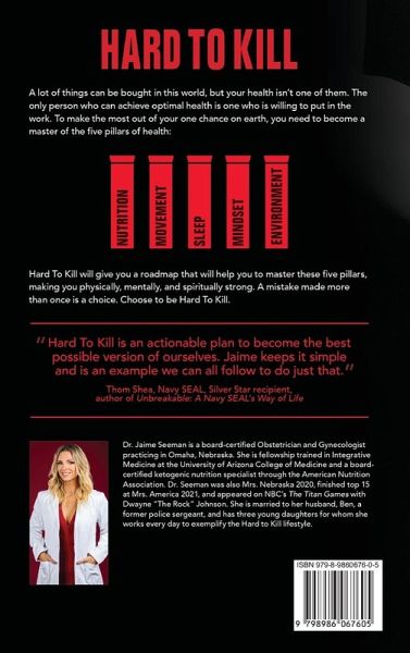 A lot of things can be bought in this world, but your health isn't one of them. The only person who can achieve optimal health is one who is willing to put in the work. To make the most out of your one chance on earth, you need to become a master of the five pillars of health: Pillar 1: Nutrition Pillar 2: Movement Pillar 3: Sleep Pillar 4: Mindset Pillar 5: Environment Hard To Kill will give you a roadmap that will help you to master those five pillars, making you physically, mentally and spiritually strong. A mistake made more than once is a choice. Choose to be Hard To Kill.