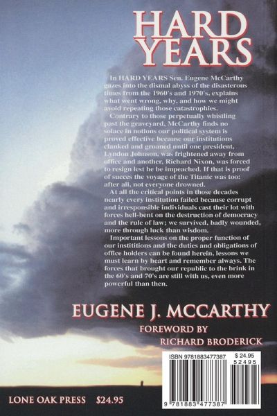 In HARD YEARS Sen. Eugene McCarthy gazes into the dismal abyss of the disastrous times from the 1960's through the 1979's explains what went wrong, why, and how we might avoid repeating those catastrophes. Contrary to those engaged in perpetually whistling past the graveyard, McCarthy finds no solace in notions our political system is proved effective because the institutions of the political process, government, law, and the press clanked and groaned until one president, Lyndon Johnson, was frightened away from office and another, Richard Nixon, was forced to resign lest he be impeached. If that is proof of success the voyage of the RMS Titanic was a success too; after all, not everyone drowned. At all the critical points in those decades nearly every responsible institution failed because irresponsible and corrupted individuals cast their lot with forces hell-bent on the destruction of the American democracy and the rule of law; we survived, badly wounded, more through luck than through wisdom. Important lessons about the proper functions of all our institutions and the duties and obligations of office holders and the need for constant vigilance can be found herein, lessons we must learn by heart and remember always since the forces that brought the republic to the brink in the 60's and 70's are still with us, even more powerful than then.