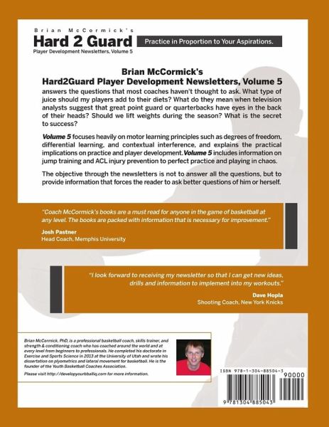 Brian McCormick's Hard2Guard Player Development Newsletters, Volume 5 answers the questions that most coaches haven't thought to ask. What type of juice should my players add to their diets? What do they mean when television analysts suggest that great point guard or quarterbacks have eyes in the back of their heads? Should we lift weights during the season? What is the secret to success? Volume 5 focuses heavily on motor learning principles such as degrees of freedom, differential learning, and contextual interference, and explains the practical implications on practice and player development. Volume 5 includes information on jump training and ACL injury prevention to perfect practice and playing in chaos. The objective through the newsletters is not to answer all the questions, but to provide information that forces the reader to ask better questions of him or herself.