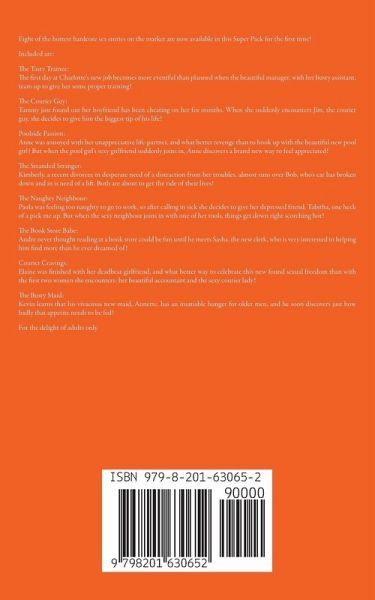 Eight of the hottest hardcore sex stories on the market are now available in this Super Pack for the first time! Included are: The Tasty Trainee: The first day at Charlotte's new job becomes more eventful than planned when the beautiful manager, with her busty assistant, team up to give her some proper training! The Courier Guy: Tammy just found out her boyfriend has been cheating on her for months. When she suddenly encounters Jim, the courier guy, she decides to give him the biggest tip of his life! Poolside Passion: Anne was annoyed with her unappreciative life-partner, and what better revenge than to hook up with the beautiful new pool girl? But when the pool girl's sexy girlfriend suddenly joins in, Anne discovers a brand new way to feel appreciated! The Stranded Stranger: Kimberly, a recent divorcee in desperate need of a distraction from her troubles, almost runs over Bob, who's car has broken down and in is need of a lift. Both are about to get the ride of their lives! The Naughty Neighbour: Paula was feeling too naughty to go to work, so after calling in sick she decides to give her depressed friend, Tabitha, one heck of a pick me up. But when the sexy neighbour joins in with one of her tools, things get down right scorching hot! The Book Store Babe: Andre never thought reading at a book store could be fun until he meets Sasha, the new clerk, who is very interested in helping him find more than he ever dreamed of! Courier Cravings: Elaine was finished with her deadbeat girlfriend, and what better way to celebrate this new found sexual freedom than with the first two women she encounters: her beautiful accountant and the sexy courier lady! The Busty Maid: Kevin learns that his vivacious new maid, Annette, has an insatiable hunger for older men, and he soon discovers just how badly that appetite needs to be fed! For the delight of adults only.