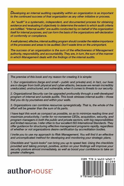 Developing an internal auditing capability within an organization is as important to the continued success of that organization as any other initiative or process. An "audit" is a systematic, independent, and documented process for obtaining evidence and evaluating it objectively to determine the extent to which audit criteria are fulfilled. "Internal audits" are audits conducted by on behalf of the organization itself for internal purposes, and can form the basis of the organizations self-declaration of conformity or compliance. A well-planned, effective, internal auditing program should consider the relative importance of the processes and areas to be audited. Don't waste time on the unimportant. The success of an organization is the sum of the effectiveness of Management authority, responsibility, and accountability. They are, in turn, the sum of the manner in which Management deals with the findings of the internal audits. The premise of this book and my reason for creating it is simple: 1. Our organizations (large and small - public and private) and, in fact, our lives are in danger from both physical and cyber-attacks, because we remain incredibly uneducated, unstructured, and vulnerable, when it comes to threats to our security. 2. Organizational Security can be upgraded profoundly through a well-developed program of internal and outside audits. This book stresses internal audits - those that you do by yourselves and within your walls. 3. Organizations can combine resources synergistically. That is, the whole of the effort will be greater than the sum of its parts. I have kept this work as compact as possible, so as to minimize reading time and maximize productivity. I write for no-nonsense CEOs, acquisition, security, and program managers in both the public and private sectors, with big responsibilities and limited resources. I refer often to four excellent ISO International Standards. They offer guidance for structuring effective management programs rapidly, regardless of whether or not organizations desire certification by accreditation bodies. I invite you to use my approach to Risk Management. You will find it an effective and uncomplicated method for developing and monitoring your strategic plans. Checklists and "quick-looks" can bring you up to speed fast. Using the checklists provided and taking prompt, positive, action on your findings will improve your security posture almost immediately, as well as boost your confidence to take on greater challenges.