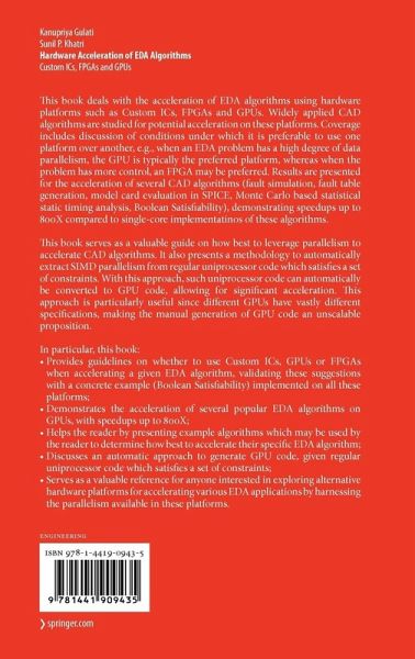 Single-threaded software applications have ceased to see signi?cant gains in p- formance on a general-purpose CPU, even with further scaling in very large scale integration (VLSI) technology. This is a signi?cant problem for electronic design automation (EDA) applications, since the design complexity of VLSI integrated circuits (ICs) is continuously growing. In this research monograph, we evaluate custom ICs, ?eld-programmable gate arrays (FPGAs), and graphics processors as platforms for accelerating EDA algorithms, instead of the general-purpose sing- threaded CPU. We study applications which are used in key time-consuming steps of the VLSI design ?ow. Further, these applications also have different degrees of inherent parallelism in them. We study both control-dominated EDA applications and control plus data parallel EDA applications. We accelerate these applications on these different hardware platforms. We also present an automated approach for accelerating certain uniprocessor applications on a graphics processor. This monograph compares custom ICs, FPGAs, and graphics processing units (GPUs) as potential platforms to accelerate EDA algorithms. It also provides details of the programming model used for interfacing with the GPUs.