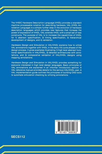 The VHSIC Hardware Description Language (VHDL) provides a standard machine processable notation for describing hardware. VHDL is the result of a collaborative effort between IBM, Intermetrics, and Texas Instruments; sponsored by the Very High Speed Integrated Cir cuits (VHSIC) program office of the Department of Defense, beginning in 1981. Today it is an IEEE standard (1076-1987), and several simulators and other automated support tools for it are available commercially. By providing a standard notation for describing hardware, especially in the early stages of the hardware design process, VHDL is expected to reduce both the time lag and the cost involved in building new systems and upgrading existing ones. VHDL is the result of an evolutionary approach to language devel opment starting with high level hardware description languages existing in 1981. It has a decidedly programming language flavor, resulting both from the orientation of hardware languages of that time, and from a ma jor requirement that VHDL use Ada constructs wherever appropriate. During the 1980's there has been an increasing current of research into high level specification languages for systems, particularly in the software area, and new methods of utilizing specifications in systems de velopment. This activity is worldwide and includes, for example, object oriented design, various rigorous development methods, mathematical verification, and synthesis from high level specifications. VAL (VHDL Annotation Language) is a simple further step in the evolution of hardware description languages in the direction of applying new methods that have developed since VHDL was designed.