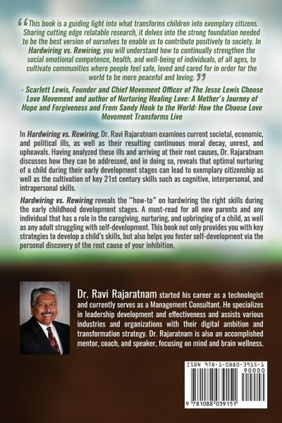 In Hardwiring vs. Rewiring, Dr. Ravi Rajaratnam examines current societal, economic, and political ills, as well as their resulting continuous moral decay, unrest, and upheavals. Having analyzed these ills and arriving at their root causes, Dr. Rajaratnam discusses how they can be addressed, and in doing so, reveals that optimal nurturing of a child during their early development stages can lead to exemplary citizenship as well as the cultivation of key 21st century skills such as cognitive, interpersonal, and intrapersonal skills. Hardwiring vs. Rewiring reveals the "how-to" on hardwiring the right skills during the early childhood development stages. A must-read for all new parents and any individual that has a role in the caregiving, nurturing, and upbringing of a child, as well as any adult struggling with self-development. This book not only provides you with key strategies to develop a child's skills, but also helps you foster self-development via the personal discovery of the root cause of your inhibition.
