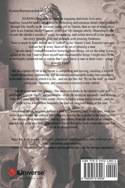 HAREM GIRL is, at its heart, an engaging and erotic love story. Sapphira, beautiful and assured, tells in unblushing and sensuous detail of her journey through life, briefly as an innocent young girl in Tunisia, then as one of eleven slave girls in an Arabian sheikh's harem, where her life changes utterly. Shamelessly, she reveals the sheikh's secrets of exotic lovemaking, and writes down all in her journal, her every thought, fear, and pleasure, with pressing frankness. There is much to learn before she is "called" to her Master. Eunuchs train and instruct her in every facet of the art of pleasing a man. ..."on one hand, I looked forward to knowing these things, yet on the other, I was aghast at the way I had to show myself and the distasteful things I might have to do. It thoroughly unnerved me to realize that I must know a man in these ways--a man I scarcely knew"... Her description of life in the harem is compelling and moving, recalling a level of lustful debauchery, submission, and decadence unimaginable today, but completely believable in the era in which it is set...and we are like the "fly on the wall" to watch intriguing, romantic, and sometimes wretched events unfold.
