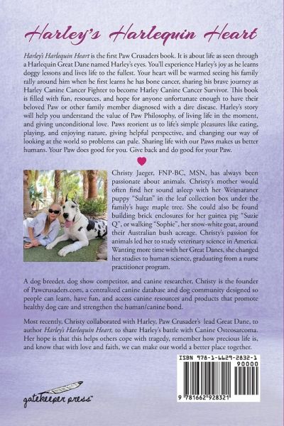Christy Jaeger, FNP-BC, MSN, is passionate about animals. As a child, her mother would find her sound asleep with her Weimaraner puppy, Sultan, under the family's huge maple tree; building brick enclosures for her guinea pig, Suzie Q; or walking her snow-white goat Sophie, around their Australian bush acreage. Christy's passion for animals led her to study veterinary science in America. Wanting more time with her Great Danes, she changed her major to human science, graduating from a nurse practitioner program.A dog breeder, dog show competitor, and canine researcher, Christy is the founder of Pawcrusaders.com, a centralized canine database and dog community. It is designed to teach, encourage fun, and provide canine resources and products that promote healthy dog care and strengthen the human/canine bond.Most recently, Christy collaborated with Harley, Paw Crusader's lead Great Dane, to author Harley's Harlequin Heart to share Harley's battle with Canine Osteosarcoma. Her goal is to help others cope with tragedy, remember life is precious, and know that with love and faith, together we can make our world a better place.