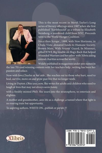 This is the most recent in Meryl Taylor's Long series of literary offerings since 1987 when she first published "Earthbound" as a tribute to Elizabeth Steinberg, a murdered child from NYC. Proceeds went to the World Hunger Coalition. Since then Scraps , 1988, with New Horizons, in Chula Vista ,donated funds to Humane Society, Brown Mare, With Avante' Guard, In Missouri, gifted WWF, Big trouble on Hog's Back that helped Wounded Warriors and her other with Xibris aiding animal charities across the world. Widely published in magazines under pen names in the late 70's and winning contests with her teachers help...writing has been her passion and solace. Now with love,Charles at her side , She reaches out to those who hurt, need to heal, survive, move on and grow past live that no longer work. Living in Dayton ,Ohio area,now, She writes for adults and children who need to laugh at lives that may not always seem funny. with a freshly minted PhD, She soars into the stratosphere, to entertain and elighten. A mother and grandmother, ,sees life as a challenge ,a tunnel where that light is no roaring train but opportunity. To aspiring authors..WRITE ON...publish or perish !!!