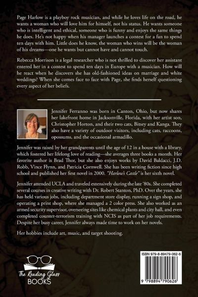 Synopsis: Page Harlow is a playboy rock musician, and while he loves life on the road, he wants a woman who will love him for himself, not his status. He wants someone who is intelligent and ethical, someone who is funny and enjoys the same things he does. He's not happy when his manager launches a contest for a fan to spend ten days with him. Little does he know, the woman who wins will be the woman of his dreams-one he wants but cannot have and cannot touch. Rebecca Morrison is a legal researcher who is not thrilled to discover her assistant entered her in a contest to spend ten days in Europe with a musician. How will he react when he discovers she has old-fashioned ideas on marriage and white weddings? When she comes face to face with Page, she finds herself questioning every aspect of her beliefs. Autobiography: Jennifer Ferranno was born in Canton, Ohio, but now shares her lakefront home in Jacksonville, Florida, with her artist son, Christopher Horton, and their two cats, Bitsey and Kanga. They also have a variety of outdoor visitors, including cats, raccoons, opossums, and the occasional armadillo. Jennifer was raised by her grandparents until the age of 12 in a house with a library, which fostered her lifelong love of reading-she averages three books a month. Her favorite author is Brad Thor, but she also enjoys works by David Baldacci, J.D. Robb, Vince Flynn, and Patricia Cornwell. She has been writing fiction since high school and published her first novel in 2000. "Harlow's Castle" is her sixth novel. Jennifer attended UCLA and traveled extensively during the late '80s. She completed several courses in creative writing with Dr. Robert Stanton, PhD. Over the years, she has held various jobs, including department store display, running a sign shop, and operating a print shop, where she managed a 2 color press. She also worked as an armed security supervisor, overseeing sites like chemical plants and city hall, and even completed counter-terrorism training with NCIS as part of her job requirements. Despite her busy career, Jennifer always made time to work on her novels. Her hobbies include art, music, and target shooting.
