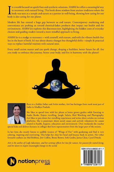 In a world focused on quick fixes and synthetic solutions, HARM less offers a meaningful way to reconnect with natural living. This book draws wisdom from ancient traditions where the body was seen as a temple and nature as a partner in well-being, showing how caring for our body is also caring for our planet. Modern life has created a huge gap between us and nature. Contemporary marketing and convenience are pushing us toward chemical-laden products that impact our health and the environment. HARM less explores this disconnection, highlighting the hidden costs of everyday choices and guiding readers toward a more mindful approach to living. HARM less is a nudge to reconnect - with yourself, with nature, and with the vibrant health that lies in the heart of both. It's not about drastic changes but thoughtful shifts - simple & practical ways to replace harmful routines with natural ones. Every small action matter and can spark change, shaping a healthier, better future for all. Are you ready to embrace this journey, honor your body, and live in harmony with the planet?