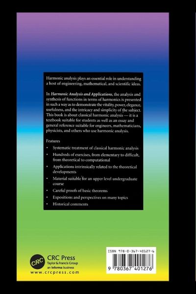 Harmonic analysis plays an essential role in understanding a host of engineering, mathematical, and scientific ideas. Harmonic Analysis and Applications presents the analysis and synthesis of functions in terms of harmonics in a way that clearly demonstrates the vitality, power, elegance, usefulness of the subject.