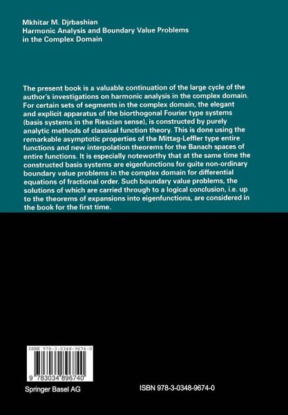 1 Preliminary results. Integral transforms in the complex domain.- 1.1 Introduction.- 1.2 Some identities.- 1.3 Integral representations and asymptotic formulas.- 1.4 Distribution of zeros.- 1.5 Identities between some Mellin transforms.- 1.6 Fourier type transforms with Mittag-Leffler kernels.- 1.7 Some consequences.- 1.8 Notes.- 2 Further results. Wiener-Paley type theorems.- 2.1 Introduction.- 2.2 Some simple generalizations of the first fundamental Wiener-Paley theorem.- 2.3 A general Wiener-Paley type theorem and some particular results.- 2.4 Two important cases of the general Wiener-Paley type theorem.- 2.5 Generalizations of the second fundamental Wiener-Paley theorem.- 2.6 Notes.- 3 Some estimates in Banach spaces of analytic functions.- 3.1 Introduction.- 3.2 Some estimates in Hardy classes over a half-plane.- 3.3 Some estimates in weighted Hardy classes over a half-plane.- 3.4 Some estimates in Banach spaces of entire functions of exponential type.- 3.5 Notes.- 4 Interpolation series expansions in spacesW1/2,?p,?of entire functions.- 4.1 Introduction.- 4.2 Lemmas on special Mittag-Leffler type functions.- 4.3 Two special interpolation series.- 4.4 Interpolation series expansions.- 4.5 Notes.- 5 Fourier type basic systems inL2(0, ?).- 5.1 Introduction.- 5.2 Biorthogonal systems of Mittag-Leffler type functions and their completeness inL2(0, ?).- 5.3 Fourier series type biorthogonal expansions inL2(0, ?).- 5.4 Notes.- 6 Interpolation series expansions in spacesWs+1/2,?p,?of entire functions.- 6.1 Introduction.- 6.2 The formulation of the main theorems.- 6.3 Auxiliary relations and lemmas.- 6.4 Further auxiliary results.- 6.5 Proofs of the main theorems.- 6.6 Notes.- 7 Basic Fourier type systems inL2spaces of odd-dimensional vector functions.- 7.1Introduction.- 7.2 Some identities.- 7.3 Biorthogonal systems of odd-dimensional vector functions.- 7.4 Theorems on completeness and basis property.- 7.5 Notes.- 8 Interpolation series expansions in spacesWs,?p,?of entire functions.- 8.1 Introduction.- 8.2 The formulation of the main interpolation theorem.- 8.3 Auxiliary relations and lemmas.- 8.4 Further auxiliary results.- 8.5 The proof of the main interpolation theorem.- 8.6 Notes.- 9 Basic Fourier type systems inL2spaces of even-dimensional vector functions.- 9.1 Introduction.- 9.2 Some identities.- 9.3 The construction of biorthogonal systems of even-dimensional vector functions.- 9.4 Theorems on completeness and basis property.- 9.5 Notes.- 10 The simplest Cauchy type problems and the boundary value problems connected with them.- 10.1 Introduction.- 10.2 Riemann-Liouville fractional integrals and derivatives.- 10.3 A Cauchy type problem.- 10.4 The associated Cauchy type problem and the analog of Lagrange formula.- 10.5 Boundary value problems and eigenfunction expansions.- 10.6 Notes.- 11 Cauchy type problems and boundary value problems in the complex domain (the case of odd segments).- 11.1 Introduction.- 11.2 Preliminaries.- 11.3 Cauchy type problems and boundary value problems containing the operators$${mathbb{L}_{s + 1/2}}$$and$$mathbb{L}_{s + 1/2}^*$$.- 11.4 Expansions inL2{?2s+1(?)} in terms of Riesz bases.- 11.5 Notes.- 12 Cauchy type problems and boundary value problems in the complex domain (the case of even segments).- 12.1 Introduction.- 12.2 Preliminaries.- 12.3 Cauchy type problems and boundary value problems containing the operators$${{mathbb{L}}_{s}}$$and$$mathbb{L}_{s}^*$$.- 12.4 Expansions inL2{?2s(?)} in terms of Riesz bases.- 12.5 Notes.