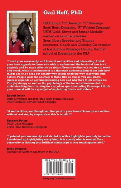 Dr. Gail Hoff writes with a clarity that makes understanding easy. In her first small volume of a three-part manual, she has been able to translate her great experience with horses and riders into straight forward descriptions of the basic elements of dressage, not only in terms of what works but also why things work. Gail explains in detail the correct position of a rider and how riders can better co-ordinate their driving aids with their receiving aids. Using this information together with her insights on how horses learn, can enable a rider to open clear two-way communication channels with the horse. Understanding how horses learn as well as understanding how to co-ordinate the aids is the key to being able to truly ride from back to front. This is a small booklet that we will read and appreciate many times over.