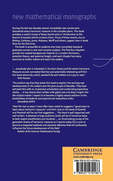During the last two decades several remarkable new results were discovered about harmonic measure in the complex plane. This book provides a careful survey of these results and an introduction to the branch of analysis which contains them. Many of these results, due to Bishop, Carleson, Jones, Makarov, Wolff and others, appear here in paperback for the first time. The book is accessible to students who have completed standard graduate courses in real and complex analysis. The first four chapters provide the needed background material on univalent functions, potential theory, and extremal length, and each chapter has many exercises to further inform and teach the readers.