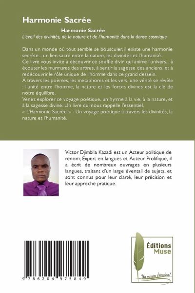 Harmonie SacréeL'éveil des divinités, de la nature et de l'humanité dans la danse cosmiqueDans un monde où tout semble se bousculer, il existe une harmonie secrète... un lien sacré entre la nature, les divinités et l'humanité.Ce livre vous invite à découvrir ce souffle divin qui anime l'univers... à écouter les murmures des arbres, à sentir la sagesse des anciens, et à redécouvrir le rôle unique de l'homme dans ce grand dessein.À travers les poèmes, les métaphores et les vers, une vérité se révèle : l'unité entre l'homme, la nature et les forces divines est la clé de notre équilibre.Venez explorer ce voyage poétique, un hymne à la vie, à la nature, et à la sagesse divine. Un livre qui nous rappelle l'essentiel.« L'Harmonie Sacrée » - Un voyage poétique à travers les divinités, la nature et l'humanité.
