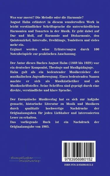 August Halm erläutert in diesem wundervollen Werk in leicht verständlicher Schriftsprache die unterschiedlichen Harmonien und Tonarten in der Musik. Er geht dabei auf Dur und Moll, auf Harmonie und Disharmonie, den Quintenzirkel, Intervalle, Dreiklänge, Tonleitern und vieles mehr ein.