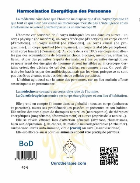 La médecine considère que l'homme ne dispose que d'un corps physique et que tout ce qui n'est pas visible au microscope n'existe pas. Pourtant, l'intelligence et les émotions ne se voient pas sous un microscope !L'homme est constitué de 8 corps imbriqués : un corps physique (de matière), un cors éthérique (d'énergies), un corps émotif (d'émotions), un corps mental (de réflexions), un cops causal (de programmes), un corps spirituel (de croyances), un corps cristal (de réception) et un corps lumière (d'émission). Au cours de la vie ces corps sont TOUS affectés par des vécus, blocages, blessures, mémoires, embarras, liens et parasites (esprits des maladies). Tous les vécus s'accumulent et ralentissent la santé. Quant aux parasites, ils se nourrissent des énergies de l'homme. Etant de différentes fréquences, ils ne sont pas visibles aux microscopes. Certains affectent les cellules et créent des déchets visibles, surnommés virus. On peut détruire les bactéries par des antibiotiques, mais pas les virus qui ne sont pas des êtres vivants mais des déchets de cellules. Comme ils sont visibles au microscope, la science pense qu'ils sont la cause des maladies virales, tout en constatant qu'ils n'arrivent pas à les détruire. L'habitat agit aussi sur la santé ; un lieu malsain affecte ses habitants en permanence.La médecine se consacre au corps physique de l'homme.La Curothérapie harmonise ses corps énergétiques et son lieu d'habitation. Elle utilise des techniques de thérapies naturelles (naturopathie), énergétiques (magnétisme, désenvoûtement) et autres (esprits de la nature). Elle se révèle efficace dans pratiquement tous les cas (burn-out, cancer, alzheimer, covid) y compris pour les animaux, puisqu'elle traite la cause. Et elle peut être pratiquée par tous.