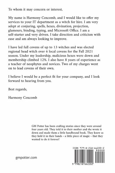 To whom it may concern or interest, My name is Harmony Coxcomb, and I would like to offer my services to your IT department as a witch for hire. I am very adept at conjuring, spells, hexes, divination, projection, glamours, binding, typing, and Microsoft Office. I am a self-starter and very driven. I take direction and criticism with ease and am always looking to improve. I have led full covens of up to 13 witches and was elected regional head witch over 6 local covens for the Fall 2021 season. Under my leadership, malicious hexes were down and membership climbed 12%. I also have 8 years of experience as a teacher of neophytes and novices. Two of my charges went on to lead covens of their own. I believe I would be a perfect fit for your company, and I look forward to hearing from you. Best regards, Harmony Coxcomb Harmony Coxcomb is visiting our world for the first time, and she wants to get the most of her human experience. She needs an apartment, a job, and money. Luckily, she has magic, so she can just fudge the truth a little with the power of her wand. When she meets Lukas, an IT professional, at her new corporate job and the sparks fly, but she discovers something at the business isn't above board. Her visit has a definite end point, so how can she right wrongs and pursue true love?