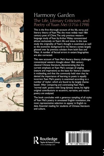 This is the first complete study of China's most popular eighteenth-century poet in any Western language. The work consists of a detailed biography, a study of Yuan's revolutionary reinterpretation of Chinese literary theory, and an analysis of his many contributions to the more original genres of Qing-dynasty (1644-1911) poetry such as narrative, historical, didactic, eccentric, and nature verse. The study is concluded by a generous and representative sampling of Yuan's poetry in translation, the first to do justice to the wide variety and richness of his oeuvre. Although many shorter poems are selected, this is the first translation to include his outstanding longer poetry. Harmony Garden will completely revise current attitudes in the west concerning classical Chines literature during the eighteenth century, a period that was long viewed as one of decline, but now appears to equal the golden ages of antiquity.