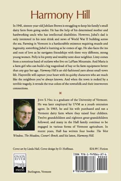 In 1941, sixteen-year-old Jubilant Brown is struggling to keep his family's small dairy farm from going under. He has the help of his determined mother and hard-working uncle who has intellectual disabilities. However, Jubal's dad is only interested in his next drink and news of World War II building across the sea. Farming in Vermont is a hardscrabble existence requiring muscle and ingenuity, something Jubal is learning as he comes of age. He also faces the ins and outs of love as he navigates friendships with three very different, strong young women. Polly is his pretty and wealthy next-door neighbor. Lizzy comes from a notorious band of outlaws who live on LaFlam Mountain. And Maria is a farm girl who can build a big wagonload of hay or fix farm equipment better than any guy her age. Harmony Hill is an old-fashioned yarn about small-town life. Hayesville will capture your heart with its quirky characters who are much like the neighbors you've always known. And when the town is rocked by a terrible tragedy, it reveals the true colors of the townsfolk and their interwoven connections.