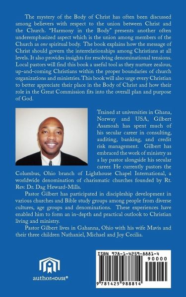 For several generations, the Body of Christ has been persistently troubled with disharmony among believers and denominations. On the one hand is the prayer of the Lord Jesus for unity in John Chapter 17. On the other hand is the strife and disunity that often characterize our relationships with one another within His Body. The mystery of the Body of Christ has often been discussed among believers with respect to the union between the Head, namely Christ, and His Body, the Church. "Harmony in the Body" presents another often underemphasized aspect which is the interrelationships among members of the Body of Christ. This book challenges the reader to appreciate the fact that unity in the Body of Christ also requires that its members see each other as one spiritual body. This has implications for all levels of Christian profession, organization and ministry. "Harmony in the Body" speaks directly to interrelationships among Christians in small or large group settings. It presents how the message of Christ should govern the daily interactions among Christians at the local church level. It also provides insights for resolving denominational tensions. Local pastors will find this book a useful tool as they nurture zealous, up-and-coming Christians within the proper boundaries of church organizations and ministries. This book will urge every Christian to better appreciate their place in the Body of Christ and how their role in the Great Commission fits into the overall plan and purpose of God.