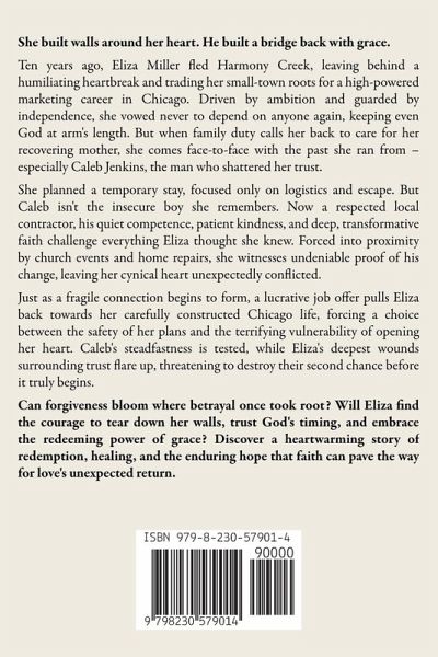 She built walls around her heart. He built a bridge back with grace. Ten years ago, Eliza Miller fled Harmony Creek, leaving behind a humiliating heartbreak and trading her small-town roots for a high-powered marketing career in Chicago. Driven by ambition and guarded by independence, she vowed never to depend on anyone again, keeping even God at arm's length. But when family duty calls her back to care for her recovering mother, she comes face-to-face with the past she ran from - especially Caleb Jenkins, the man who shattered her trust. She planned a temporary stay, focused only on logistics and escape. But Caleb isn't the insecure boy she remembers. Now a respected local contractor, his quiet competence, patient kindness, and deep, transformative faith challenge everything Eliza thought she knew. Forced into proximity by church events and home repairs, she witnesses undeniable proof of his change, leaving her cynical heart unexpectedly conflicted. Just as a fragile connection begins to form, a lucrative job offer pulls Eliza back towards her carefully constructed Chicago life, forcing a choice between the safety of her plans and the terrifying vulnerability of opening her heart. Caleb's steadfastness is tested, while Eliza's deepest wounds surrounding trust flare up, threatening to destroy their second chance before it truly begins. Can forgiveness bloom where betrayal once took root? Will Eliza find the courage to tear down her walls, trust God's timing, and embrace the redeeming power of grace? Discover a heartwarming story of redemption, healing, and the enduring hope that faith can pave the way for love's unexpected return.