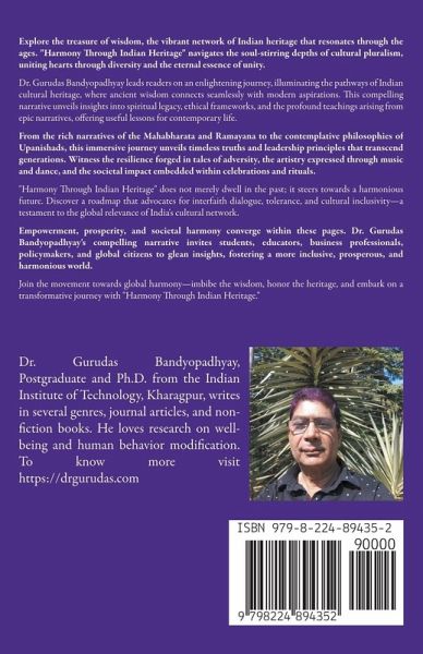 Explore the treasure of wisdom, the vibrant network of Indian heritage that resonates through the ages. "Harmony Through Indian Heritage" navigates the soul-stirring depths of cultural pluralism, uniting hearts through diversity and the eternal essence of unity. Dr. Gurudas Bandyopadhyay leads readers on an enlightening journey, illuminating the pathways of Indian cultural heritage, where ancient wisdom connects seamlessly with modern aspirations. This compelling narrative unveils insights into spiritual legacy, ethical frameworks, and the profound teachings arising from epic narratives, offering useful lessons for contemporary life. From the rich narratives of the Mahabharata and Ramayana to the contemplative philosophies of Upanishads, this immersive journey unveils timeless truths and leadership principles that transcend generations. Witness the resilience forged in tales of adversity, the artistry expressed through music and dance, and the societal impact embedded within celebrations and rituals. "Harmony Through Indian Heritage" does not merely dwell in the past; it steers towards a harmonious future. Discover a roadmap that advocates for interfaith dialogue, tolerance, and cultural inclusivity-a testament to the global relevance of India's cultural network. Empowerment, prosperity, and societal harmony converge within these pages. Dr. Gurudas Bandyopadhyay's compelling narrative invites students, educators, business professionals, policymakers, and global citizens to glean insights, fostering a more inclusive, prosperous, and harmonious world. Join the movement towards global harmony-imbibe the wisdom, honor the heritage, and embark on a transformative journey with "Harmony Through Indian Heritage."