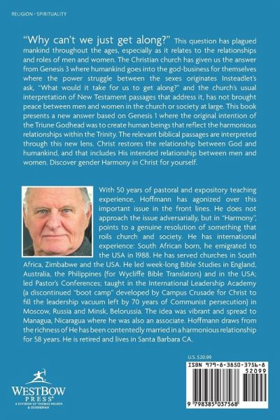 "Why can't we just get along?" This question has plagued mankind throughout the ages, especially as it relates to the relationships and roles of men and women. The Christian church has given us the answer from Genesis 3 where humankind goes into the god-business for themselves where the power struggle between the sexes originates Insteadlet's ask, "What would it take for us to get along?" and the church's usual interpretation of New Testament passages that address it, has not brought peace between men and women in the church or society at large. This book presents a new answer based on Genesis 1 where the original intention of the Triune Godhead was to create human beings that reflect the harmonious relationships within the Trinity. The relevant biblical passages are interpreted through this new lens. Christ restores the relationship between God and humankind, and that includes His intended relationship between men and women. Discover gender Harmony in Christ for yourself.
