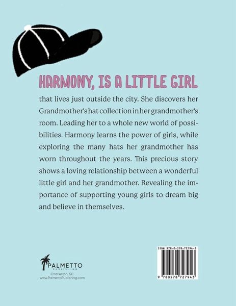 Harmony, is a little girl that lives just outside the city. She discovers her Grandmother's hat collection in her grandmother's room. Leading her to a whole new world of possibilities. Harmony learns the power of girls, while exploring the many hats her grandmother has worn throughout the years. This precious story show a loving relationship between a wonderful little girl and her grandmother. Revealing the importance of supporting young girls to dream big and believe in themselves.